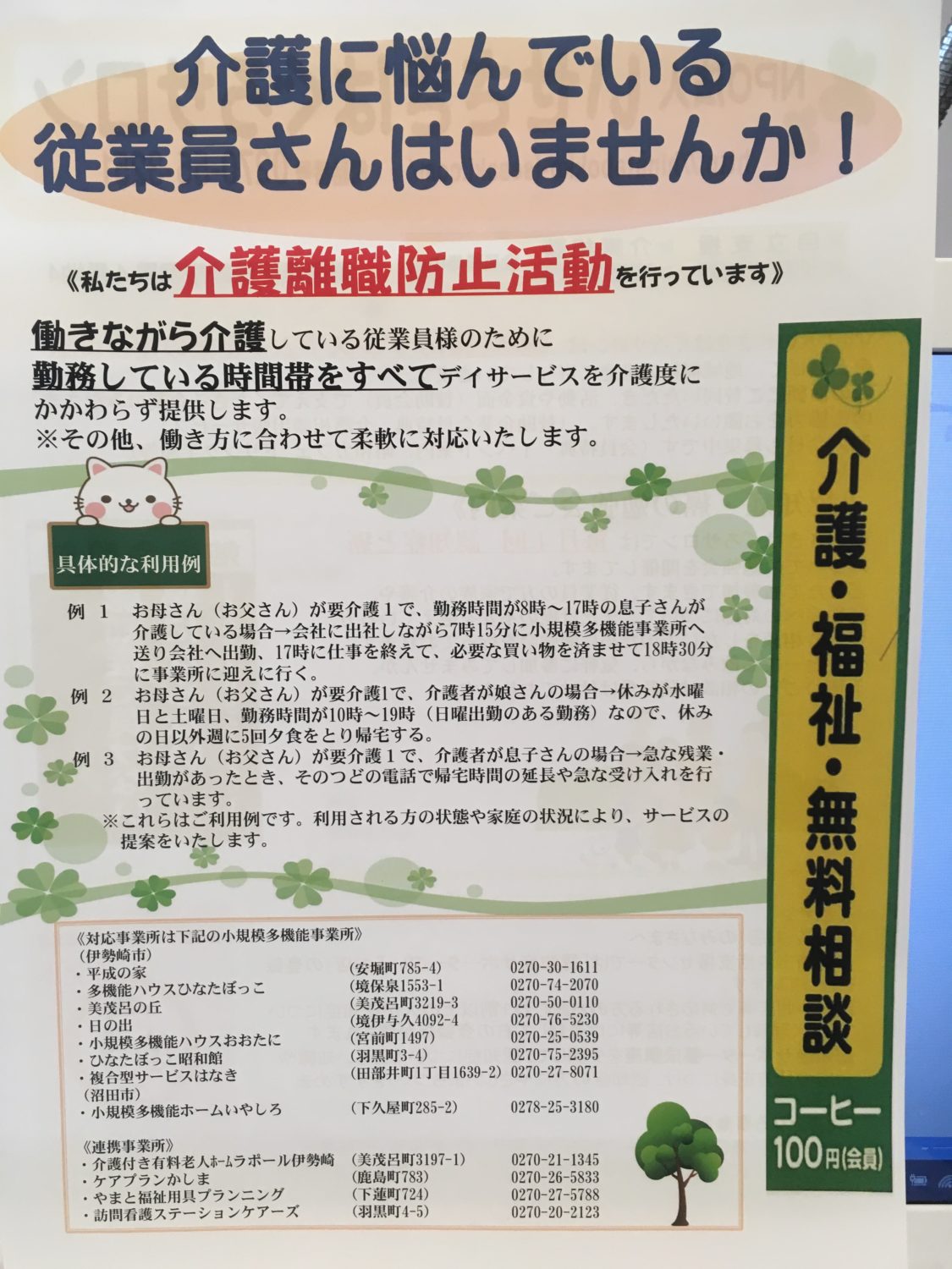 - 小規模多機能事業所では、賛助会員企業の従業員様のために介護保険の限度額に関わらず必要に応じて、朝7時 ~ 夜7時までサービス提供致します(送迎はご家族でお願いします)