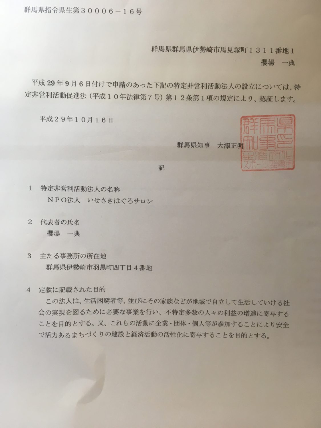 10月16日NPO法人いせさきはぐろサロン設立申請、25日登記 投稿日 2017年10月22日 更新日 2018年7月2日 著者 ひなたぼっこ カテゴリー いせさきはぐろサロン ツイート 認証書をとりに行ってきました。 次は登記です。 参加者募集します。 ツイート